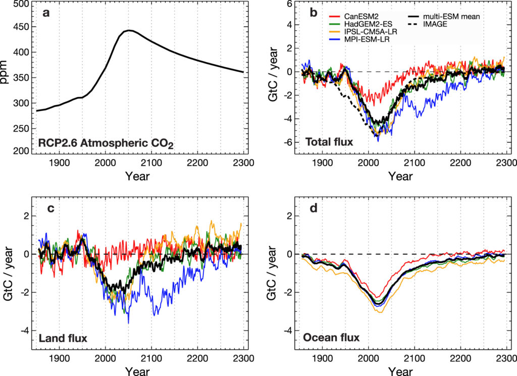 Discovery that the Earth system models suggest significant weakening, even potential reversal, of the ocean and land sinks under future low emission scenarios.